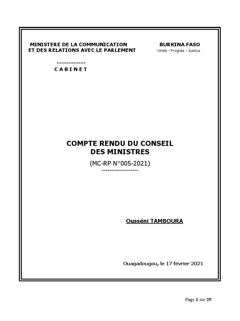 Compte Rendu Du Conseil Des Ministres De Ce Jour Au Burkina Faso